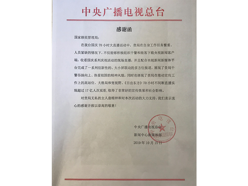 10月15日,中央廣播電視總臺致函我局,對我局鼎力支持央視開展國慶70周年大型直播活動表示感謝,并對我局一線民警職工在直播過程中展現(xiàn)出來的昂揚向上、熱愛祖國的良好精神風貌致以崇高敬意。