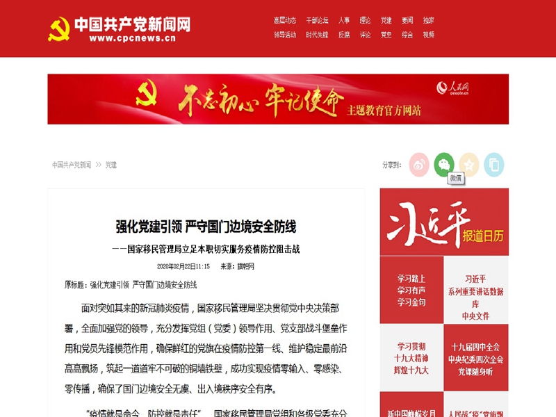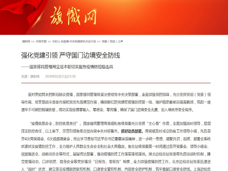 近日,由中央和國家機(jī)關(guān)工委主辦的“旗幟網(wǎng)”在“黨委(黨組)之聲”專欄,刊發(fā)了我局“強(qiáng)化黨建引領(lǐng) 嚴(yán)守國門邊境安全防線——國家移民管理局立足本職切實服務(wù)疫情防控阻擊戰(zhàn)”的經(jīng)驗做法,“中國共產(chǎn)黨新聞網(wǎng)”“人民網(wǎng)”等多家網(wǎng)站予以轉(zhuǎn)載,集中宣傳了全國移民管理機(jī)構(gòu)加強(qiáng)黨的領(lǐng)導(dǎo)、服務(wù)保證疫情防控和維穩(wěn)管控的主要做法,充分展示了各級在抗擊疫情中涌現(xiàn)出的先進(jìn)典型和感人事跡,展現(xiàn)了移民管理機(jī)構(gòu)堅決打贏疫情防控阻擊戰(zhàn)的擔(dān)當(dāng)作為。