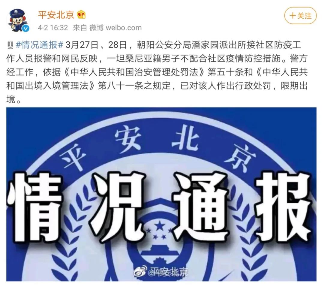 剛剛,北京市公安局通報(bào):3月27日、28日,朝陽(yáng)公安分局潘家園派出所接社區(qū)防疫工作人員報(bào)警和網(wǎng)民反映,一坦桑尼亞籍男子不配合社區(qū)疫情防控措施。警方經(jīng)工作,依據(jù)《中華人民共和國(guó)治安管理處罰法》第五十條和《中華人民共和國(guó)出境入境管理法》第八十一條之規(guī)定,已對(duì)該人作出行政處罰,限期出境。