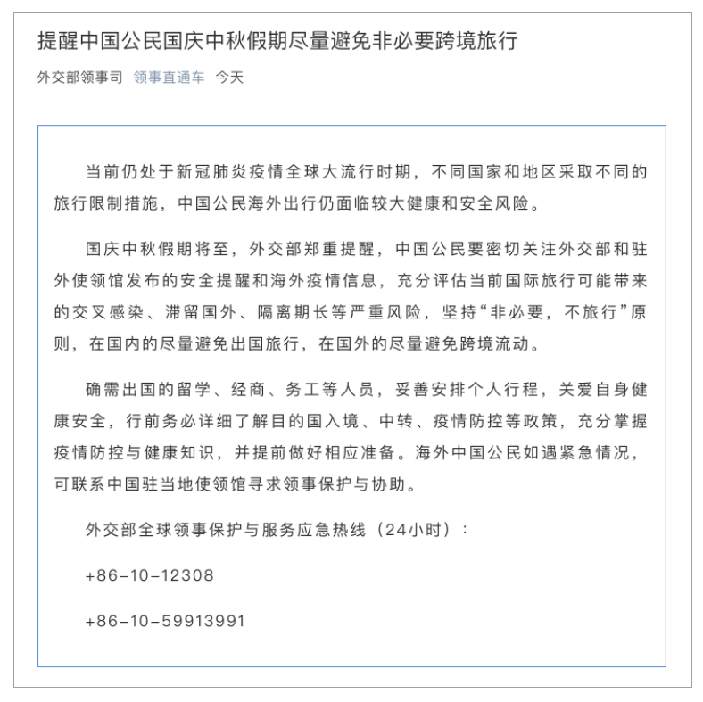 國慶中秋假期將至,外交部鄭重提醒,中國公民要密切關(guān)注外交部和駐外使領(lǐng)館發(fā)布的安全提醒和海外疫情信息,充分評估當(dāng)前國際旅行可能帶來的交叉感染、滯留國外、隔離期長等嚴(yán)重風(fēng)險,堅持“非必要,不旅行”原則,在國內(nèi)的盡量避免出國旅行,在國外的盡量避免跨境流動。