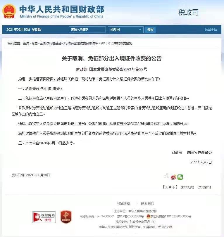 為進(jìn)一步推進(jìn)清費降費,減輕居民負(fù)擔(dān),現(xiàn)將取消、免征部分出入境證件收費政策公告如下: