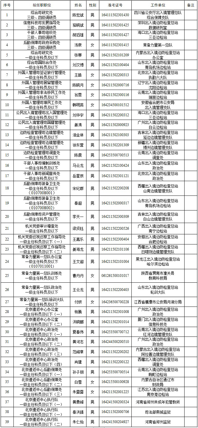 根據(jù)2022年度中央機(jī)關(guān)公開遴選公務(wù)員工作有關(guān)要求,經(jīng)過筆試、體能測評(píng)、職位業(yè)務(wù)水平測試、面試、體檢和考察等程序,確定陳宏斌等39名同志為國家移民管理局?jǐn)M任用公務(wù)員,現(xiàn)予以公示。公示期如有問題,請(qǐng)向國家移民管理局干部人事司反映。