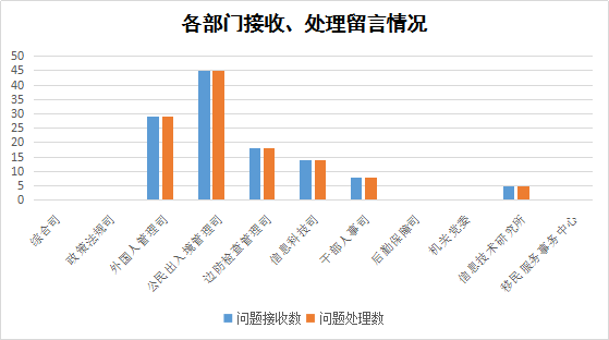 從留言接收回復(fù)情況看,各部門均能及時(shí)有效答復(fù)。截至2019年10月8日,網(wǎng)站留言答復(fù)率為100% 。其中,公民出入境管理司、外國(guó)人管理司、邊防檢查司接收問(wèn)題數(shù)較多,分別為45條、29條、18條。