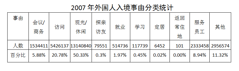 2007年全國出入境邊防檢查機(jī)關(guān)共檢查出入境人員3.45億人次,同比增長8.38%,其中內(nèi)地居民8132.85萬人次、外國人出入境5207.19萬人次、港澳居民2.24億人次、臺灣同胞923.64萬人次,同比分別增長18.49%、17.61%、2.93%及4.83%,香港成為內(nèi)地居民出境首選地區(qū)。