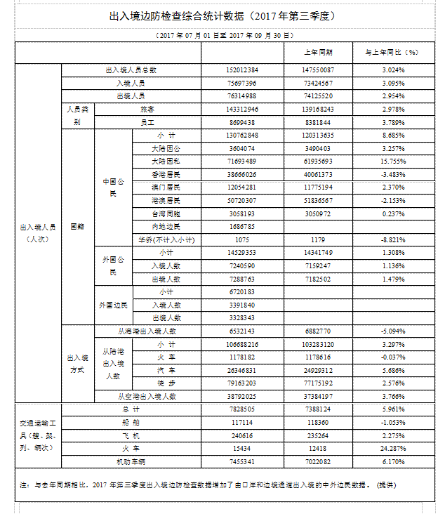 出入境邊防檢查綜合統(tǒng)計(jì)數(shù)據(jù)(2017年第三季度)