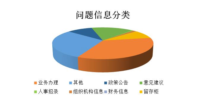 從留言類型看,涉及業(yè)務(wù)辦理類的留言最多,共計(jì)226條,占比34.72%;其他類留言共計(jì)191條,占比為29.34%;意見建議類共計(jì)留言103條,占比為15.82%;政策公告類留言共計(jì)62條,占比9.52%;組織機(jī)構(gòu)類留言共計(jì)8條,占比為1.23%;人事招錄類留言共計(jì)4條,占比0.61%。