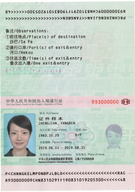 邊境旅游專用出入境通行證樣式