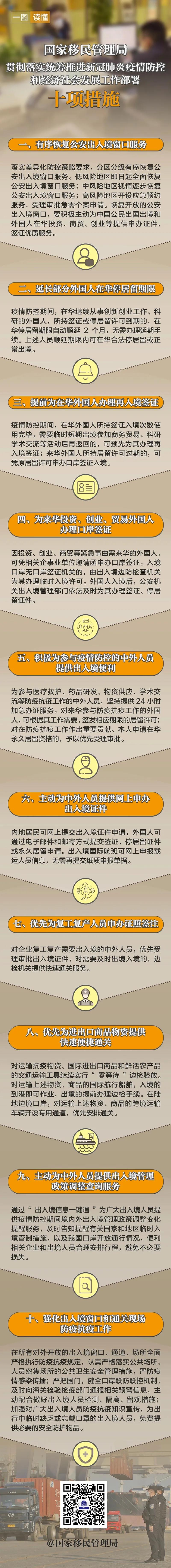 目前,國家移民管理局已向全國移民出入境管理部門作出部署,要求加強領(lǐng)導、嚴密組織,確保不折不扣落實落地、取得扎實成效。十項措施實施后,將為廣大中外人員提供更加優(yōu)質(zhì)便捷的出入境服務(wù),進一步增強中外人員戰(zhàn)勝疫情的信心,便利中外人員往來,積極服務(wù)企業(yè)復工復產(chǎn),促進經(jīng)濟社會發(fā)展。