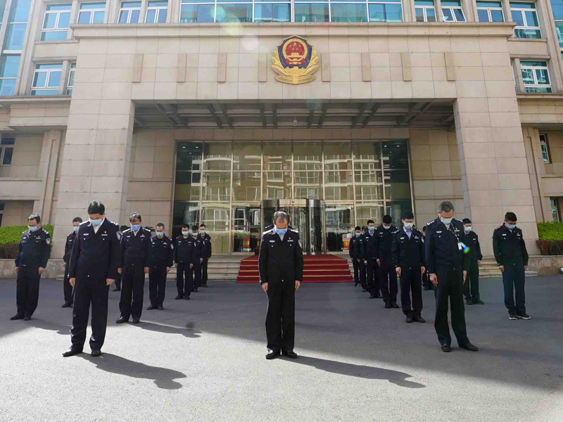 為表達(dá)全國(guó)各族人民對(duì)抗擊新冠肺炎疫情斗爭(zhēng)犧牲烈士和逝世同胞深切哀悼,國(guó)務(wù)院決定2020年4月4日舉行全國(guó)性哀悼活動(dòng)。4日10時(shí),伴隨著防空警報(bào)鳴響,汽車(chē)?guó)Q笛,李裕祿副局長(zhǎng)和機(jī)關(guān)全體值班備勤民警在局機(jī)關(guān)辦公樓前肅立默哀,向抗擊新冠肺炎疫情斗爭(zhēng)犧牲烈士和逝世同胞致哀。