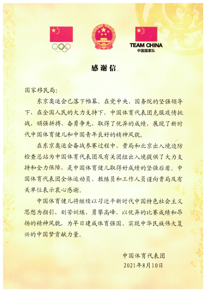 中國體育代表團(tuán)向國家移民管理局發(fā)來感謝信