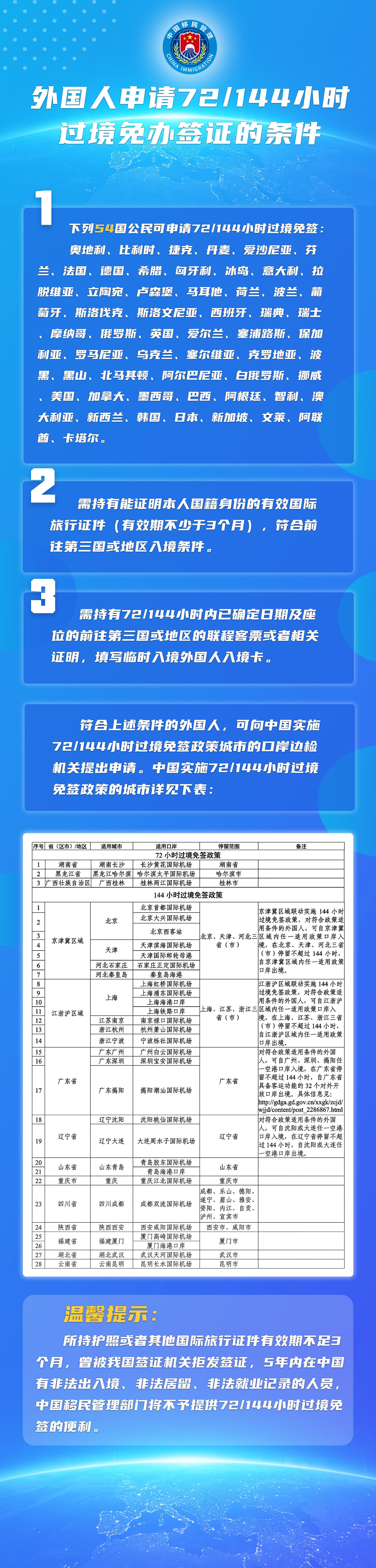目前,中國長沙、哈爾濱、桂林等3個(gè)城市實(shí)施72小時(shí)過境免簽政策,北京、天津、石家莊、秦皇島、上海、南京、杭州、寧波、廣州、深圳、揭陽、沈陽、大連、青島、重慶、成都、西安、廈門、武漢、昆明等20個(gè)城市實(shí)施144小時(shí)過境免簽政策。54國公民憑有效國際旅行證件和限定時(shí)間內(nèi)確定日期及座位的聯(lián)程客票過境上述城市前往第三國(地區(qū)),可免辦簽證在規(guī)定區(qū)域內(nèi)停留不超過72小時(shí)或144小時(shí),停留期間,可從事旅游和臨時(shí)商務(wù)訪問等短期活動(dòng)。