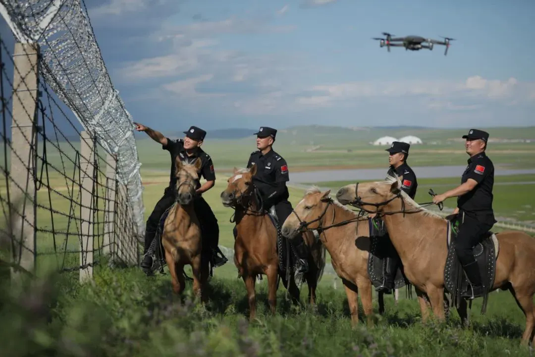 夏季治安打擊整治行動(dòng)期間,內(nèi)蒙古錫林郭勒邊境管理支隊(duì)馬背警隊(duì)聯(lián)合無人機(jī)警航隊(duì)開展邊境巡邏。
